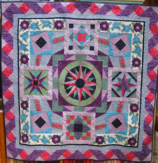 The next one is my Mariner's Compass Quilt which was started to accompany a workshop about 18 months ago (or maybe longer). In fact I finished the piecing by this time last year and took it on holiday with me to Italy which is where I started the quilting. Then it got put on the back-burner for almost a year. I just got it out the other week and finished off the quilting.